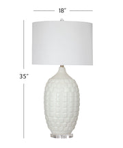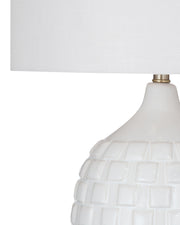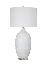 The Sesser Table Lamp features a sleek white ceramic base with a square stamped pattern, adding a stylish touch to any space. The contemporary design is complemented by an acrylic support base that provides stability while enhancing the lamp's modern appeal. The white drum shade softens the light, creating a warm and inviting atmosphere perfect for living rooms, bedrooms, or offices. With its clean lines and elegant details, the Sesser Table Lamp seamlessly fits into a variety of interior styles, bringing both form and function to your home.