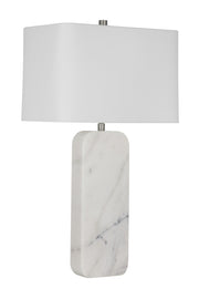 The Systin Table Lamp is the epitome of contemporary elegance, featuring a sleek white marble body that boasts natural veining for a unique and sophisticated appearance. The marble's cool tones are paired with a clean-lined rectangular shade, creating a striking contrast and enhancing the lamp's modern profile. This lamp not only serves as a source of light but also as a piece of art, perfect for adding a touch of luxury and refined style to any modern living space or office.