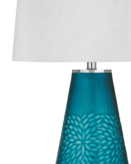 The Marly Table Lamp blends contemporary coastal style with refined detail, featuring a blue carved glass base that adds texture and depth. An acry...