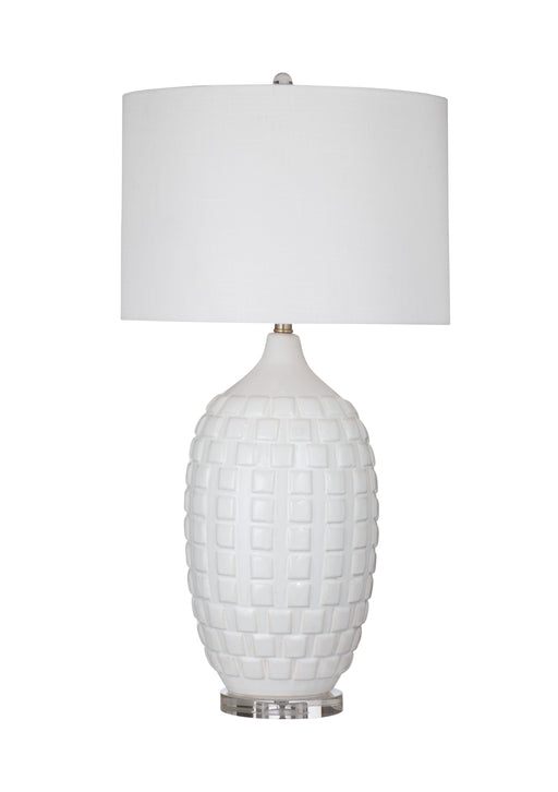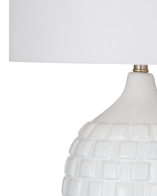 The Sesser Table Lamp features a sleek white ceramic base with a square stamped pattern, adding a stylish touch to any space. The contemporary desi...