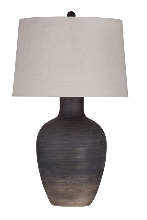 The Volga Table Lamp is crafted of resin with a neutral tapered shade.Product Features This black table lamp features a Boho style The tapered drum...