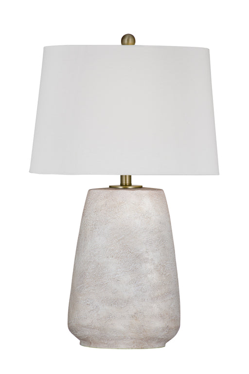 The Candra Table Lamp features a resin base in a light cement finish and a white drum shade.Product Features This gray table lamp features a Modern...