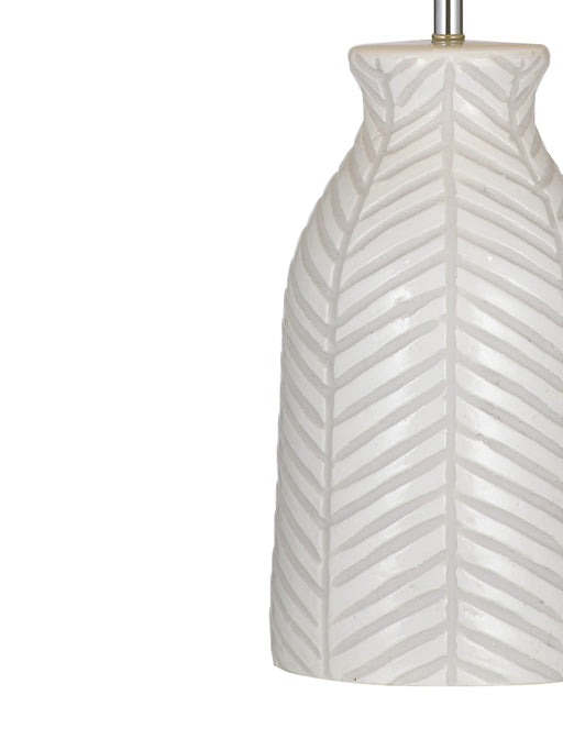 The Sanbro Table Lamp features a ribbed motif with a white drum shade.Product Features Features a 3 Way Turn Off light switch Bulb Type A required,...