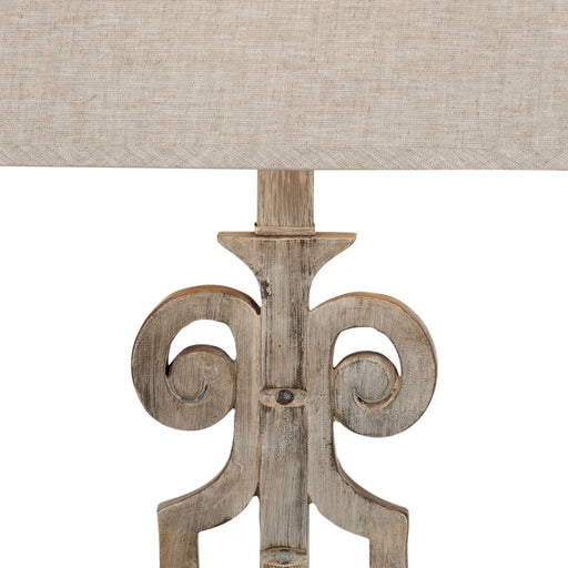 Ornate curvature and a weathered gray finish make this Belgian luxe style table lamp the perfect stately addition to any space.Product Features Fea...