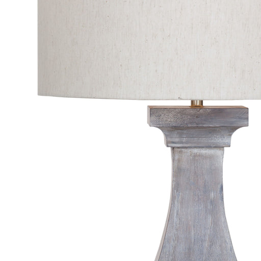 The Derek Table Lamp is crafted of mango wood in a distressed gray finish with a natural linen tapered drum shade.Product Features The gray washed ...