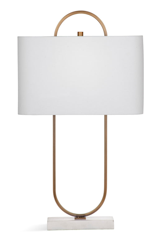 The Mabel Table Lamp showcases a sleek modern design with a lustrous brass finish atop a marble base, paired with an oval white linen shade for an ...