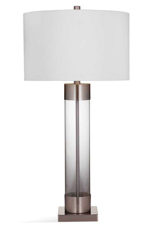 The Tennison Table Lamp is crafted of clear glass and brushed nickel with a white drum shade.Product Features The tall clear lamp body and brushed ...