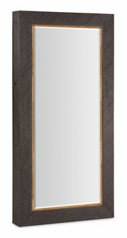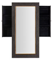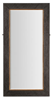 Evoke the rustic grandeur and dramatic vistas of the American wilderness with the Big Sky Floor Mirror. Crafted of Wood and resin, it is finished in Furrowed Bark, a charcoal color with a crosshatch texture with a contrasting trim in Vintage Natural around the mirror. The mirror features left and right pullouts lined with black felt for jewelry storage with three rows of 15 necklace hooks and two rows of ring slots. Attaches to the wall.