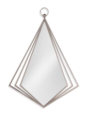 The Chanda Wall mirror features dramatic art deco styling with a geometric metal frame finished in silver and a pendant ring top.