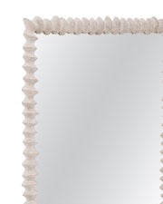 The Churchill Wall Mirror blends modern appeal with artisan craftsmanship. Its rectangular shape is framed by uniquely carved wood in a distressed white wash finish, offering a fresh yet timeless look that elevates any interior.