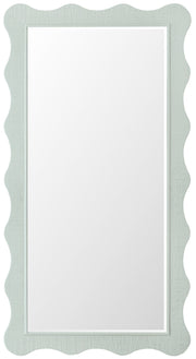Elevate your entryway or bedroom with the Waverly Leaner Mirror, featuring a scalloped silhouette, beveled glass, and a unique blue-green painted raffia frame. A bold blend of texture and color for modern eclectic spaces.