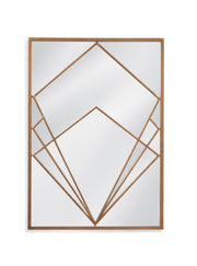 The Jase Wall mirror features a thin metal frame finished in gold with gold triangular overlay design.