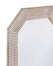 The Michael Wall Mirror features a unique octagonal shape framed by a multi-layered, geometric pattern with a white-washed finish that lends a modern yet distressed look. The intricate detailing around the frame adds depth and texture, which is softened by the whitewash technique, blending rustic charm with contemporary lines. This mirror is a statement piece that would complement a modern interior with its clean, angular silhouette and artistic frame design.