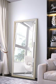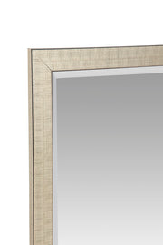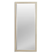 *Select framed mirrors are built to order in our warehouse in Bassett, VA. Please allow 3 weeks for shipping once your order is received.* Rachel Floor Mirror frame has an aged silver leaf finish with warm champagne undertones, distress marks and a band running along the inside and outside edges of the molding face with a beveled glass. Mirror Glass Size: 30L x 72H. Weight: 47 LBS. Material: Wood, Mirror Glass. Wall Mounting: Anti-tipping hardware included. It is not recommended to hang on the wall. Made in the USA.