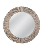 Splay Wall Mirror is a round decorative wall mirror made of eucalyptus reeds. The mirror frame features white washed eucalyptus stick and mango wood.