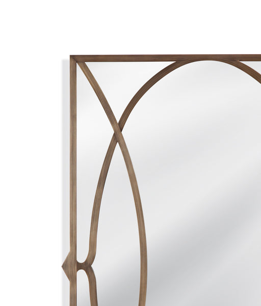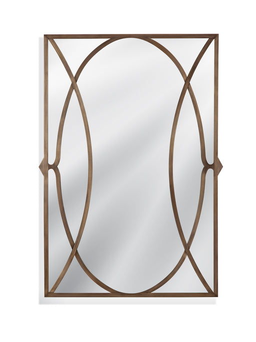 The Lattice Wall Mirror boasts a rectangular shape with an interlocking circle pattern, framed in bronze-finished metal, seamlessly blending modern...