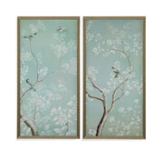Birds and Flowers II features a matte paper print with a 1" brushed silver with gold undertones molding.