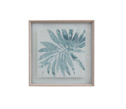Burlap Ocean Palm IV is a straight cut print floating in clear glass surrounded by a 7/8" weathered washed frame.