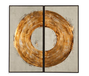 Ring of Fire is set of two hand painted canvases featuring gold metallic paint in a black floater frame. This will make a statement in any modern setting.