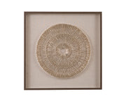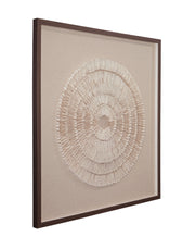 The Vesica Wall Art features a modern shadowbox-style design with boho aesthetics, combining texture and depth for a unique visual impact. Intricate 3D rice paper creates a delicate round art piece set against a soft linen background, adding layers of interest and warmth. The brown frame enhances the earthy, natural feel, making it a perfect addition to a variety of interior styles. This piece brings a sense of craftsmanship and artistic flair, creating a focal point that blends contemporary design with bohemian charm.
