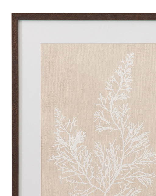 Cystoseira Ericoides is a print framed in a 3/4" dark walnut frame with an ivory matboard.Product Features Beige and white coral print on white mat...