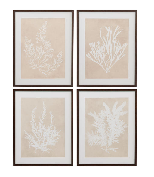 This set of four prints is framed in a 3/4" dark walnut frame with an ivory matboard.Product Features Beige and white coral print on white matboard...