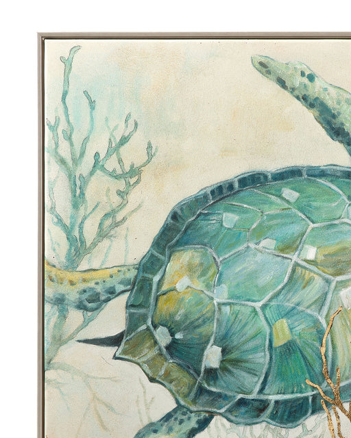 Alanton Framed Canvas - Beige / GreenProduct Features Sea turtle swimming through coral reefs Rich blue and green hues with subtle pops of color Wr...