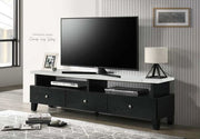 Embrace modern sophistication and functionality with this stunning entertainment console, designed to be the centerpiece of any contemporary living space. Featuring a sleek dark finish with an elegant faux marble top, this piece combines luxury and practicality. The robust construction ensures durability while providing ample storage for all your media needs. It offers generous shelving spaces and smooth-gliding drawers accented with chic, minimalist handles. Elevated on sturdy block legs, this console not only enhances the visual space of your room but also keeps your entertainment area tidy and stylish.