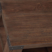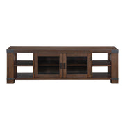 The Arusha TV Stand effortlessly blends rustic style with modern amenities. A rich medium cherry finish is accented by riveted black metal brackets and distressed wood scoring for a beautiful home entertainment hearth that will balance and center any room. The low-profile design places your television at the perfect viewing angle while offering a combination of fixed and adjustable shelves ample space for electronic storage, all while ensuring open sight lines for uninterrupted remote signal access. This stand serves not just as a home for your TV, but as a harmonious centerpiece for any room.