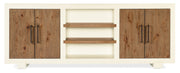 Inspired by the natural beauty of the American wilderness, the Tahoe Entertainment Console features a two-tone finish that marries Avalanche White with Vintage Natural, a warm finish over rustic Hickory Veneers. Avalanche recalls the blankets of snow that feed the streams of rivers of America’s Western landscapes. With 4 doors with soft-close hinges and accented by dark brushed bronze bar pulls, there are two adjustable shelves behind each pair of doors and two adjustable shelves in the center section, along with a ventilated back panel and a power supply. Accommodates up to an 80-inch TV.