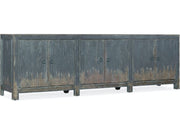 Inspired by the Belgian design aesthetic, the Salvator Media Console is alluring in its simple sophistication. The finish is a heavily distressed aged blue with dry brushing and rub-through with matching blue painted hardware. There are six doors with one adjustable wood shelf behind each pair of doors, and a three-plug outlet and ventilated back panel. Accommodates up to an 80-inch TV.
