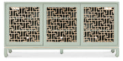 A light and airy garden gets a dash of Asian flavor in the Trellis Entertainment Credenza. Crafted of Maple Veneers and Silver Leaf, the exterior is painted light green with champagne-colored open fretwork, accent trim and a chow leg style. Behind each of the three doors with soft-close hinges and touch latches are two adjustable wood shelves and wire management. Accommodates up to a 70-inch TV.