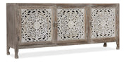 Exquisitely hand carved Mango Wood on the front of this three-door entertainment console creates an iconic and imposing stylish look for your home. The serene neutral finish is accomplished with a cream glaze and heavy distressing over a medium wood tone. Antique bronze-colored bar pull hardware with a cream glaze completes the look. Featuring 3 doors, the left pair of doors has one fixed shelf behind, and the right door has one fixed shelf behind, and there is a ventilated back panel. Accommodates up to an 80-inch TV.