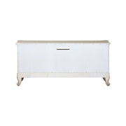 Exclusively designed and filled with romantic spirit, the beautiful Gorsedd entertainment center features Queen Anne legs and carved apron and trim, decorated with raised and oversized scrolled moldings in a golden ivory finish. This sophisticated living room unit has matching case pieces including a center TV stand and large left and right facing piers with mirrored backs, ensuring plenty of unique storage and display space. The collection boasts of multiple glass doors and glass display shelves and an elegantly arched and lighted center bridge. This stylish and detailed piece is ideal for entertaining guests and will add elegance to any living room Decor.