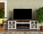 The Hampton 97” Fireplace TV Stand Console from Bridgevine Home delivers a flawless combination of modern farmhouse style and country simplicity. Beautifully crafted from Poplar Solids, Okoume Veneers and Knotty Alder, this Fireplace Entertainment Center features a two-tone Jasmine Whitewash and Barnwood finish and oil-rubbed Bronze hardware. Ideal for TVs up to 100 inches, this Fireplace TV Stand includes four glass windowpane doors, three shelves and cable management on the back panel for media and gaming console storage. The 42” electric fireplace insert includes a remote control and multiple settings allow for heat up to 400 square feet. Four (included) screws make securing the fireplace insert to the console quick and simple.