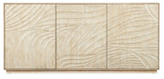 Tranquil and modern with a tropical retreat-inspired vibe, the Retreat Entertainment Center has a striking carved wave motif on the door fronts. Crafted of Oak Veneers and Resin, the case is finished in the sand-colored Dune finish, while the door fronts have a lighter contrasting finish. The entertainment center features three doors with soft-close hinges and touch-latches, two adjustable shelves behind the left door, two adjustable shelves behind the pair of right-side doors, a ventilated back panel and a three-plug electrical outlet located behind the pair of right doors.