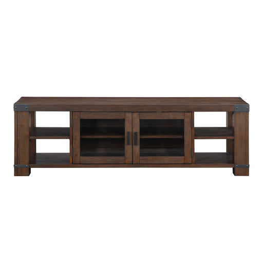The Arusha TV Stand effortlessly blends rustic style with modern amenities. A rich medium cherry finish is accented by riveted black metal brackets...