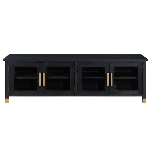The 64-inch Yves TV Stand boasts clean lines and a modern profile, finished in sleek black with brushed brass accents. Its glass doors enable seaml...