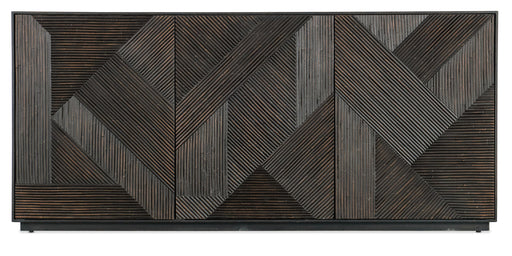 A tactile and intricate solid wood pattern highlights the Commerce & Market Entertainment Console, featured in a transparent black finish that ...