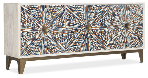 Create an atmosphere of celebration every day with the uplifting Liberty Entertainment Console, featuring a festive starburst bone inlay pattern in...