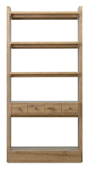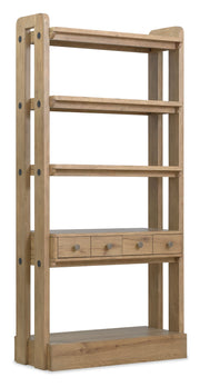 Inspired by industrial design, the Kalamazoo Bookcase features an aged oak veneer finish that evokes the feel of vintage workshops. This bookcase offers three shelves for open storage, two center drawers, and a hidden drawer in the base for added functionality. Its exposed connector accents add a rustic touch, making it an ideal piece for both modern and traditional interiors.