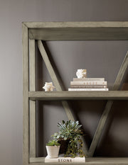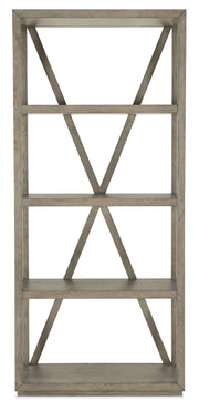 With a rustic, weathered finish, crisp lines and an organic grain pattern, the Wisemans Etagere has a classic X-back and chic silhouette with four fixed shelves. Crafted of Oak Veneers, the etagere is finished in the soft smoked gray Mink. Anti-tip hardware is included.
