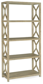 Create a resort-inspired retreat with the Surfrider Etagere, featuring a wood frame crafted of Pecan Veneers finished in the light natural Driftwood finish. The laid-back vibe of this California casual-inspired piece is enhanced by geometric fretwork on the sides of the four fixed shelves.