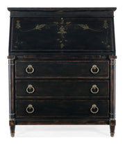 Inspired by the classic coastal charm and rich history of Charleston, this venerable secretary is finished in the heirloom-quality Black Cherry dark patina. Accented by handpainting on the drop-front lid, the secretary features a robus leather writing insert, 3 cubbies for storage and 3 small drawer behind the drop-front, along with 3 lower drawers with self-closing drawer guides and cherry-colored interiors. Pewter-colored pulls.