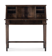 A retro, nostalgic silhouette is updated for today in the Commerce & Market Secretariat Secretary. Crafted of Clean Acacia Solids in a dark natural wood finish, it features a drop-down work surface, two pullout supports, one center drawer, two tray drawers inside the drop-front and two removable wood shelves inside the drop-front and wire management. Wood stretchers on the sides and back complement the slender legs with metal ferrules.