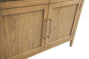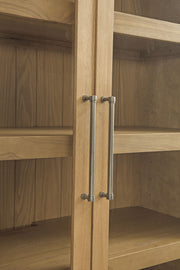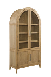 The Fynn Blonde Oak Display Cabinet elegantly blends modern and traditional designs, crafted entirely in a warm blonde oak finish. Made from solid wood and flat cut oak veneers, this cabinet exudes a uniform and inviting appearance. It features two large arched doors on the top, opening to reveal three adjustable shelves, perfect for custom displays. Below, a single adjustable shelf equipped with antique nickel-finished bar pulls adds both functionality and a stylish touch to the piece. This all-blonde oak finish enhances its versatility, making it an ideal choice for various home decors.