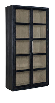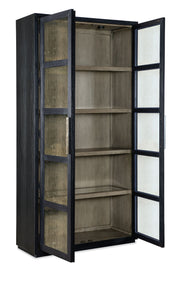 With the aura of a rustic mountain cottage, the Linville Falls Curio Cabinet has two wood-framed doors with seeded glass inserts. Crafted of Pine Veneers, the cabinet has a charred black finish achieved through Shou Sugi Ban, a Japanese technique that creates a look resembling burnt wood. The interior is finished in Mink, a soft smoked gray. There are three adjustable wood-framed glass shelves, one fixed wood-framed glass shelf and two puck lights in the top with a three-intensity touch switch on the right side back panel. Textured metal bar pulls have an antique pewter finish.