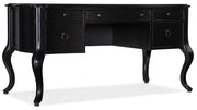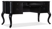 Casual yet refined and stylish, the Bristowe Executive Desk sets a professional and inviting tone for any work-from-home space. The dramatic desk silhouette is crafted of Pecan Veneers in a Tuxedo black paint finish with touches of warm brown, and is accentuated by oil-rubbed bronze-finished rings and pull hardware and boldly-shaped cabriole legs. The desk offers 4 drawers, with the left drawer a file drawer with pendaflex system and full extension metal ball bearing slides and the top right drawer featuring a removable pencil tray, inserts and removable writing slide with full extension metal ball bearing slides. The center drawer has a drop-front for keyboard use and a wire cutout in the back of the drawer. The right bottom drawer has a false bottom with finger hold for hidden storage and is on full extension metal ball bearing slides. The desk is finished on all sides so it can float in a room.
