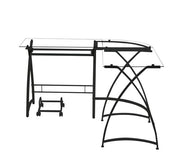 Corner Computer Desk Orientation: "L" ShapeX-Shape Metal Frame BaseRectangular Table Top w/Tempered GlassKey Board Tray IncludedComputer Holder Included