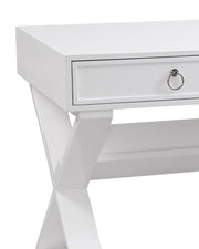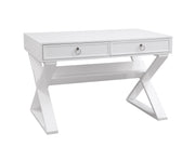 The Everly Desk showcases modern glam design without sacrificing practicality. Crafted with solid and manufactured wood in a high-gloss white painted finish, it exudes timeless charm. The unique X-base design adds a distinctive touch, while the built-in storage shelf with two drawers on full-extension glides offers both style and functionality.